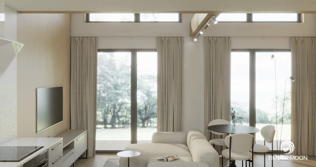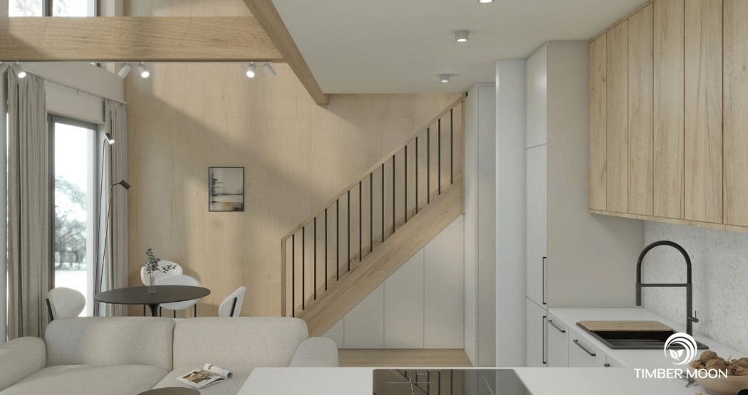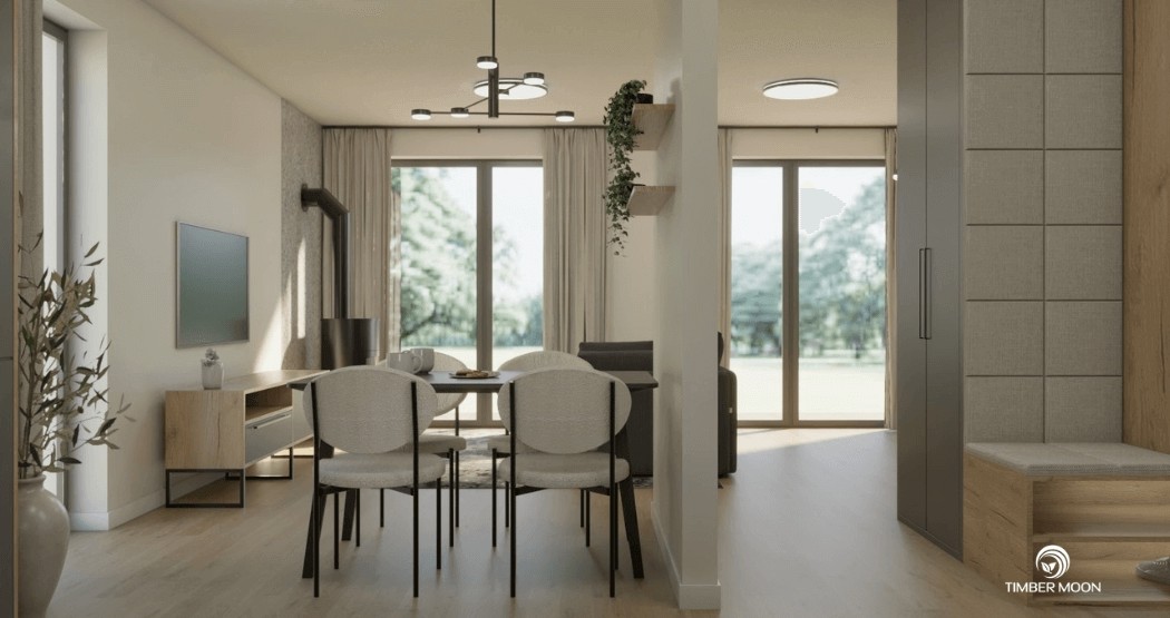 Drevený dom Timber Moon model 127 je ideálnym návrhom pre tých, ktorí hľadajú priestranný, pohodlný a funkčný dom. Veľká plocha – až 127 m² – poskytuje priestor na bývanie, oddych a spoločné trávenie času pre celú rodinu. Vďaka premyslenému usporiadaniu miestností si tu nájde svoje miesto každý člen rodiny. Mnohí ľudia si vyberajú náš modulárny dom model 127 pre jeho funkčnosť a ergonomický interiér.