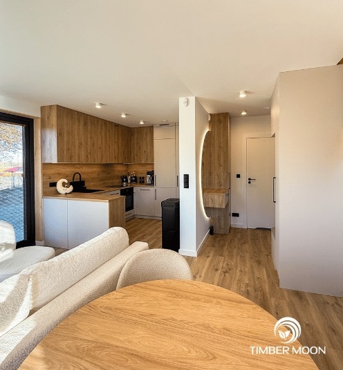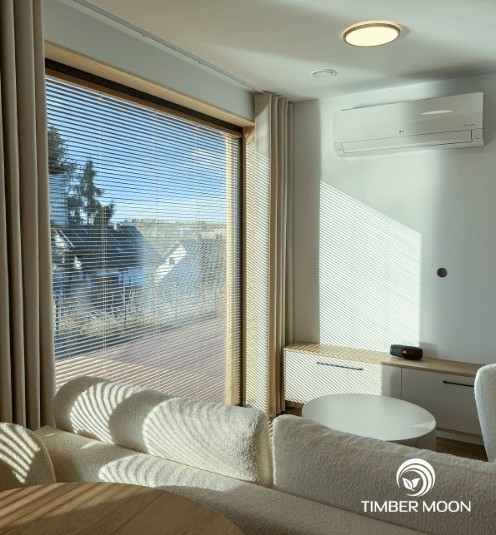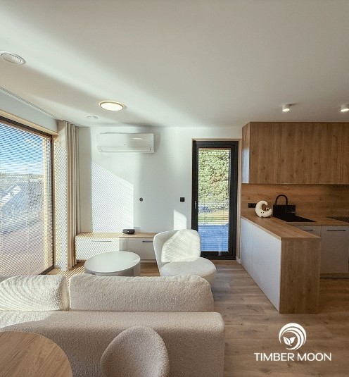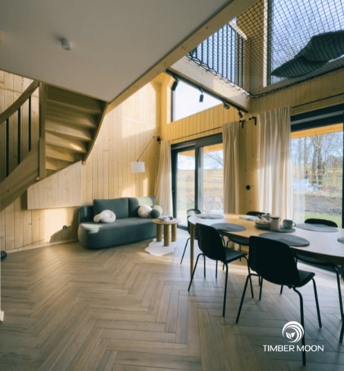 Drevo použité na konštrukciu, ako aj povrchové úpravy pôsobia prirodzene esteticky a teplo a dodávajú interiéru jedinečný šarm. Budova spĺňa všetky normy pre obytné budovy, čo znamená, že ju môžu využívať celé generácie.